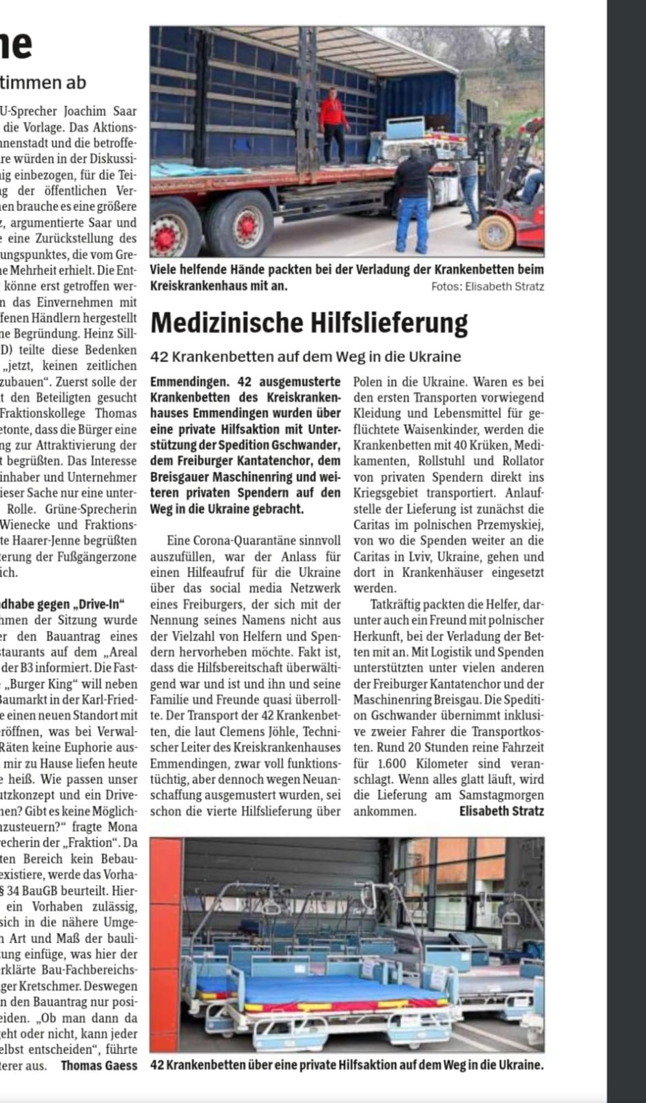 Kreiskrankenhaus Emmendingen spendet Klinikbetten für Hilfstransport (veröffentlicht am So, 20. März 2022 um 18:00 Uhr auf badische-zeitung.de),